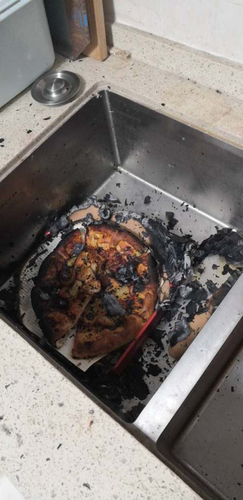 In the evening we ordered Pizza but something went wrong and it ended up being delivered to the wrong building. When it finally arrived it was cold so naturally I put it into the oven. Which I had forgot how to operate properly. This was the result: